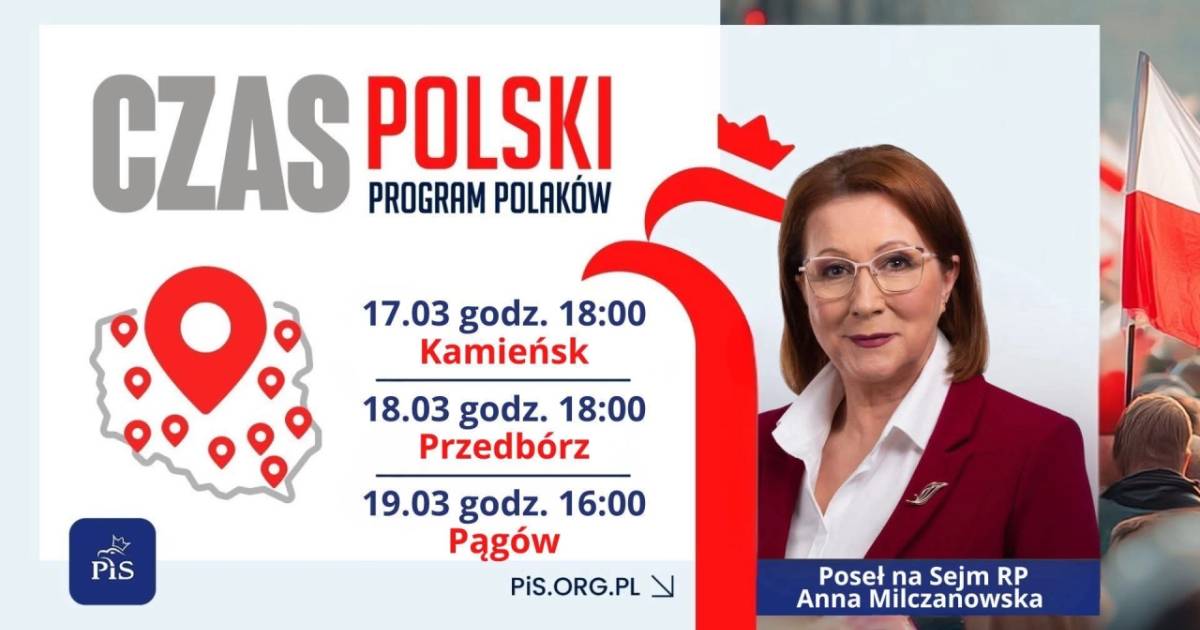 Poseł Anna Milczanowska zaprasza mieszkańców na otwarte spotkania w ramach programu „Czas Polski. Program dla Polaków”. W najbliższych dniach będą miały miejsce trzy spotkania w powiecie radomszczańskim.